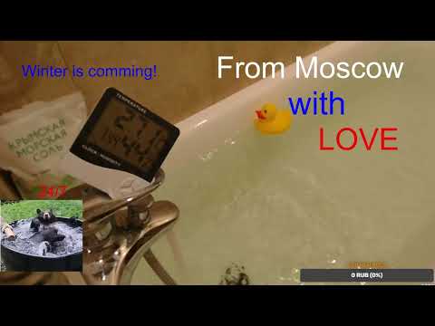 Новый стример под ником russianhotwater подписал трансляцию «From Moscow with love». На картинке видна ванна с водой в помещении и термометр, показывающий около 30 градусов. Рядом с ванной лежит пакет «Крымская морская соль». Трансляция сопровождается музыкой Любэ «Комбат», Агаты Кристи «Я не забуду о тебе никогда», Высоцкого «Баллада о борьбе» и другими композициями.