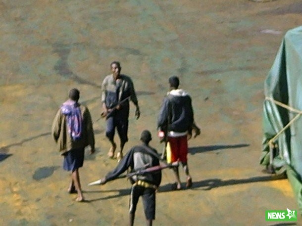Пираты, вооруженные автоматическим оружием, полезли на борт. Часть команды судна забаррикадировалась в каютах и по радио запросила помощь военного флота.