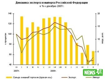По данным ФТС, темпы сокращения импорта в течение последних месяцев практически постоянно ускорялись. Так, в январе снижение показателя составило 35 процентов по сравнению с аналогичным периодом годом ранее. В январе-апреле текущего года импорт из стран дальнего зарубежья составил 40,63 миллиарда долларов, сократившись на 39,8 процента по сравнению с первыми четырьмя месяцами 2008 года.