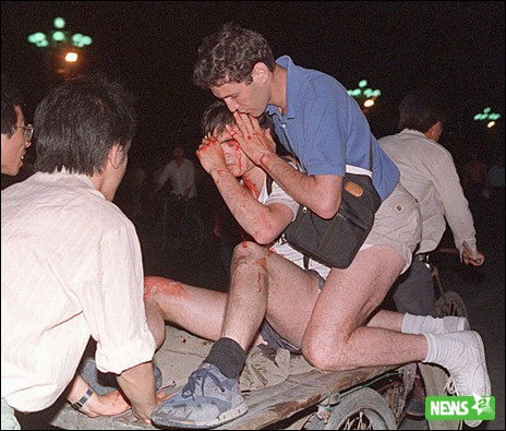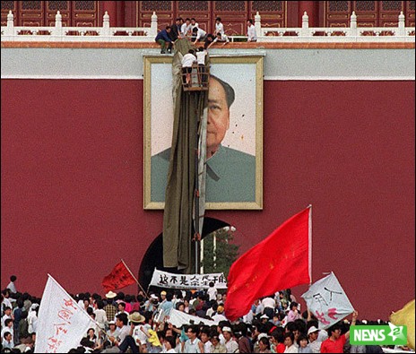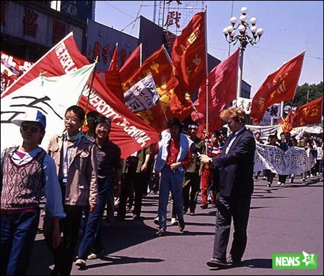Не очень понятно большое колличество европейцев на большинстве фотографий :) на второй даже одни рулит какой-то демострацией. (обкатка оранжевых революций, охренеть как был слаб большой Китай в 1989).