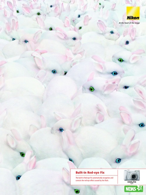 Всем известно, что у белых кроликов красные глаза, так как они альбиносы. Но агентство Sylva, создавшее этот рекламный принт для Nikon, считает, что новая встроенная опция этих фотоаппаратов Red-eye Fix может убрать красные глаза даже у таких кроликов.