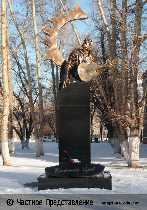 В Барнауле официально открыли памятник легендарному рок-музыканту, лидеру группы "Кино" Виктору Цою. Фигура музыканта с запрокинутой вверх и в сторону головой и с гитарой в руках выполненная из металла. Цой как бы вырастает из огромной каменной стелы, а над головой у него простирается своеобразный полукруг. "Это свет звезды по имени Солнце", — пояснили в инициативной группе по установке монумента.