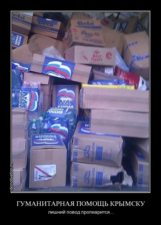 Прекрасно. Вас возмутила «клевета» на вашу «любимую» партию, по средствам «порчи» денежных знаков мелкого наминала. А что скажите про агитацию, на гуманитарной помощи крымску, которую давали добровольцы. А ведроедные мудилы, втихоря доклеивали наклейки на неё? Да даже если и сами отправляли, на свои кровно-наворованные средства, но обклеивали. Вам этро не противно, пиар на горе? Это нормально же, да? Никого никчему привлекать не надо же? :)))