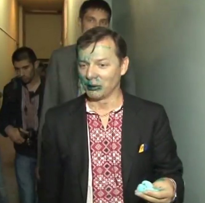 Депутата Олега Ляшко облили зеленкой во Львове. Это произошло около 22:00 возле Высокого Замка, перед зданием Львовской областной телерадиокомпании.