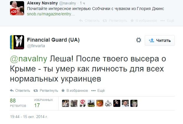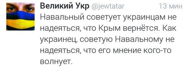«Я считаю, что, несмотря на то, что Крым был захвачен с вопиющим нарушением всех международных норм, тем не менее реалии таковы, что Крым сейчас является частью РФ. И давайте не будем обманывать себя.С сожалением сказал Навальный