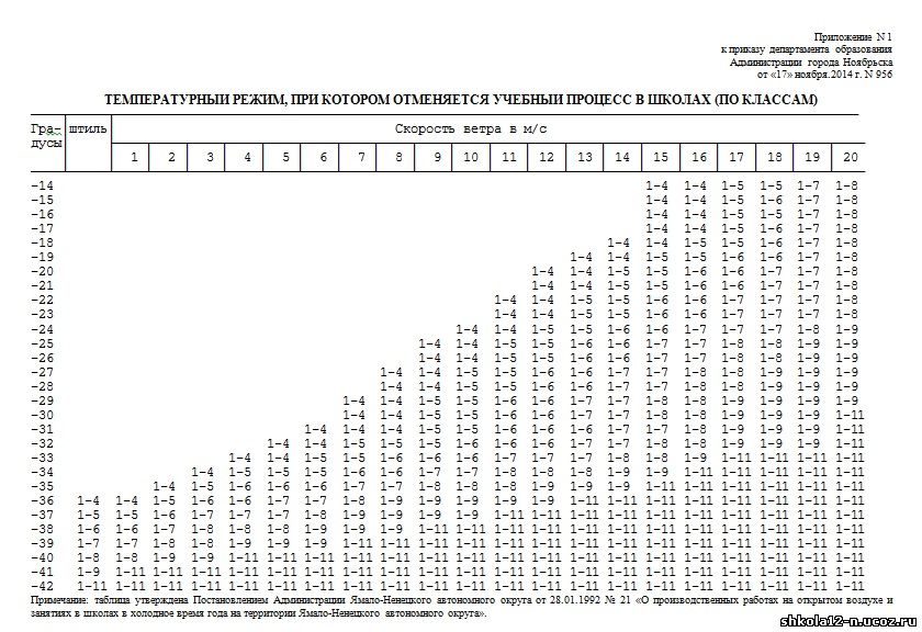 — при температуре воздуха -45 градусов и ниже для обучающихся с 1 по 5 класс;о скорости ветра ничего