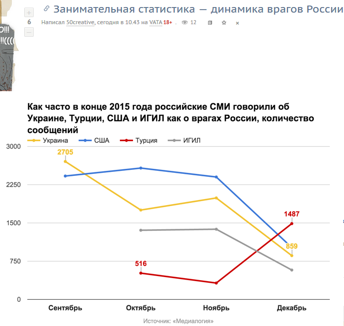 К концу года определился новый «главный враг» России по версии СМИ и блогов. После инцидента с самолетом Су-24 им стала Турция. «Если раньше Турцию в контексте терроризма упоминали примерно 20 раз в неделю, то после 24 ноября количество сообщений „Турция, терроризм“ увеличилось до полутора сотен», — говорится в материале.