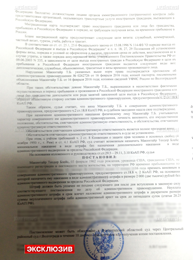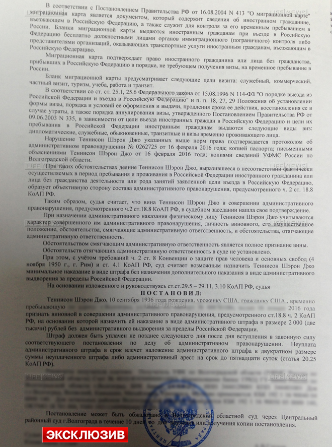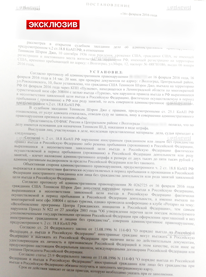 Согласно протоколу об администравном правонарушении 0262725 от 16 фенразя 2016 года гражданин США Теннисои 111>рон Джо допусщла нарушение правил въезда в Российскую Федерацию, выразившееся в несоответствии ыявленной цели въезда в Российскую Федерацию фактически осуществляемой в период пребывания и Российской Федерации деятельности, а именно въехала по многократной визе сфо 308004 с целью туризма однако проводила конференцию в клубе «Ротари» на тему: «Возобновление программы Центра Гражданских инициатив в Российской Федерации», тем самым нарушила Приказ N 922 от 27 декабря 2003 года "(X) утверждении перечня цели поездок используемого >полномочснными государственными органами Российской Федерации при оформлении приглашений и виз иностранным гражданином и лицами без |ражллнствам, совершив административное правонарушение, предусмотренное ч. 2 ст. 18.8 КоАП РФ.