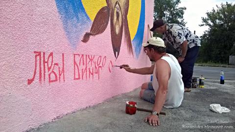 Как сообщает сайт «Православная жизнь», Образ Иисуса Христа с евангельской цитатой «Люби ближнего своего, как самого себя» был создан на внешней стене бывшего поста ГАИ, расположенного на перекрестке улиц Дубровский шоссе и Первомайская, художниками Владимиром Кравчуком и Валентином Ретьманом по просьбе городского совета. Планировалось ко Дню города, 21 сентября, нанести сакральные изображения и на других постах Госавтоинспекции.