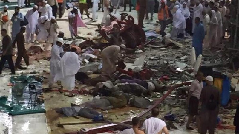 Во время паломничества в прошлом году произошло страшное событие на территории священной мечети, в результате обрушения массивного строительного крана. Этот кран был самый большой кран, который находился вместе с десятками других кранов, работающих над проектом саудовцев по расширению святыни. Эти краны не были убраны далеко от святого места во время паломничество в период массового движения населения. Событие совпало с годовщиной 11 сентября 2015 года и 27 зихаде 1436 года по л.х, когда обрушившийся кран в запретной мечети оставил 107 паломников погибшими и 238 раненными.