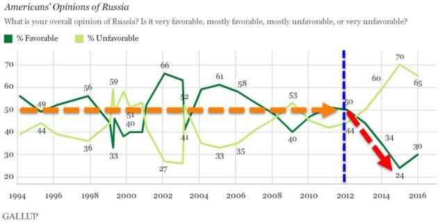 The Gallup Organization 20 февраля 2017 г. провела опрос, из которого стало ясно, что Россия получила крайне низкий рейтинг одобрения в США – 28%. Создание «плохого» образа РФ в США стартовало в 2012