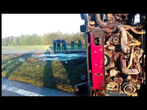 Похоже на то, что от столкновения с автоцистерной корпус автобуса принял на себя приличную дозу ГСМ и затем своим корпусом размазал жидкость по асфальту.