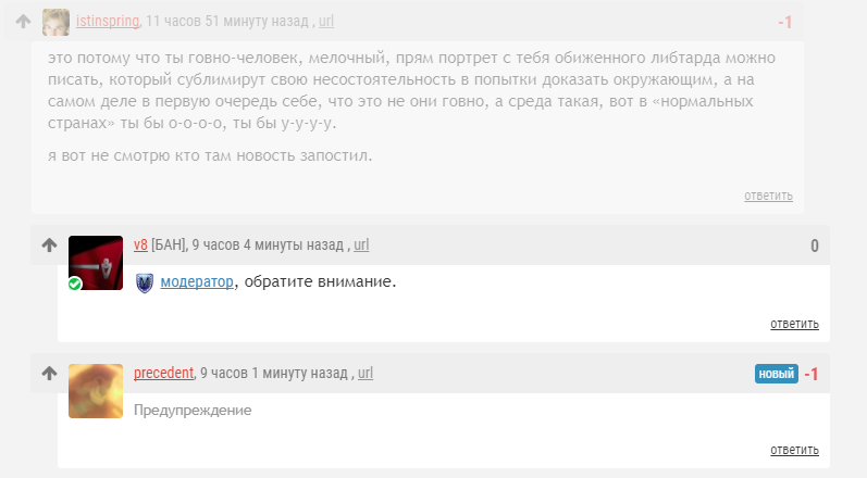 Наконец-то у нас нормальная модерация появилась. Новый модератор аргументирует, подробно обьясняет свои действия. А не как командер: «посиди в бане, пожалуй» и все тут. Уверен, что precedent будет последовательным модератором.
