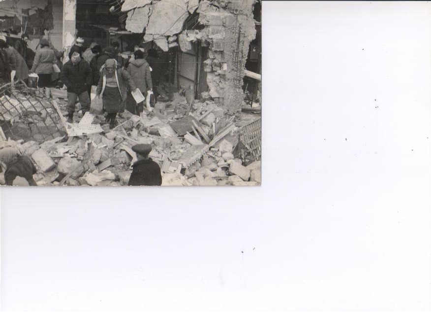 «Спитак. 6 января 1989. Население растаскивает товары из городского универмага. У бабушки в пакете тапочки и пластинки.»