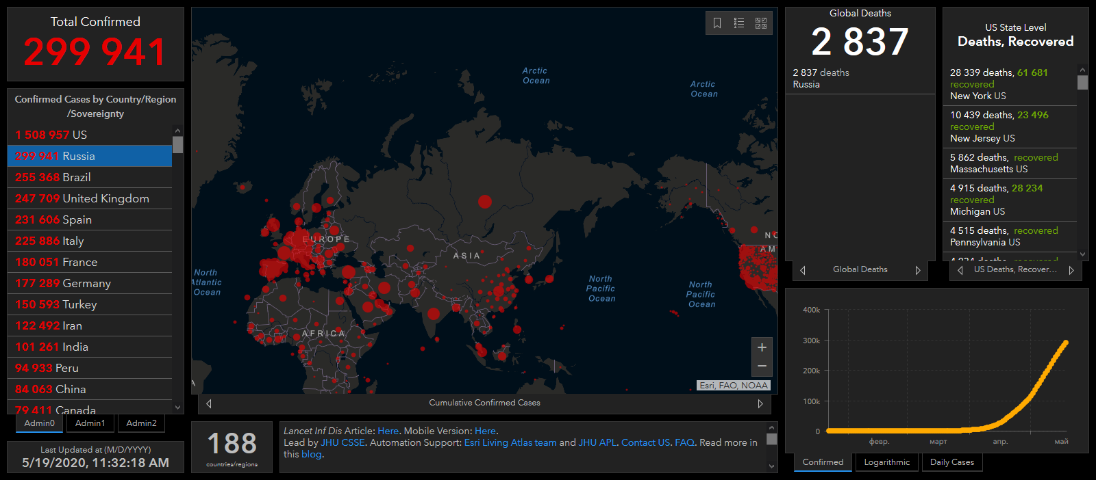 [18.05/COVID-19] В России проведено >7,35 млн. тестов (+205,3 тыс. в сутки), зарегистрировано 299941 инфицированных (+9263 (3,2%)), выздоровело 76130 человек (+5921), 2837 скончалось (+115)