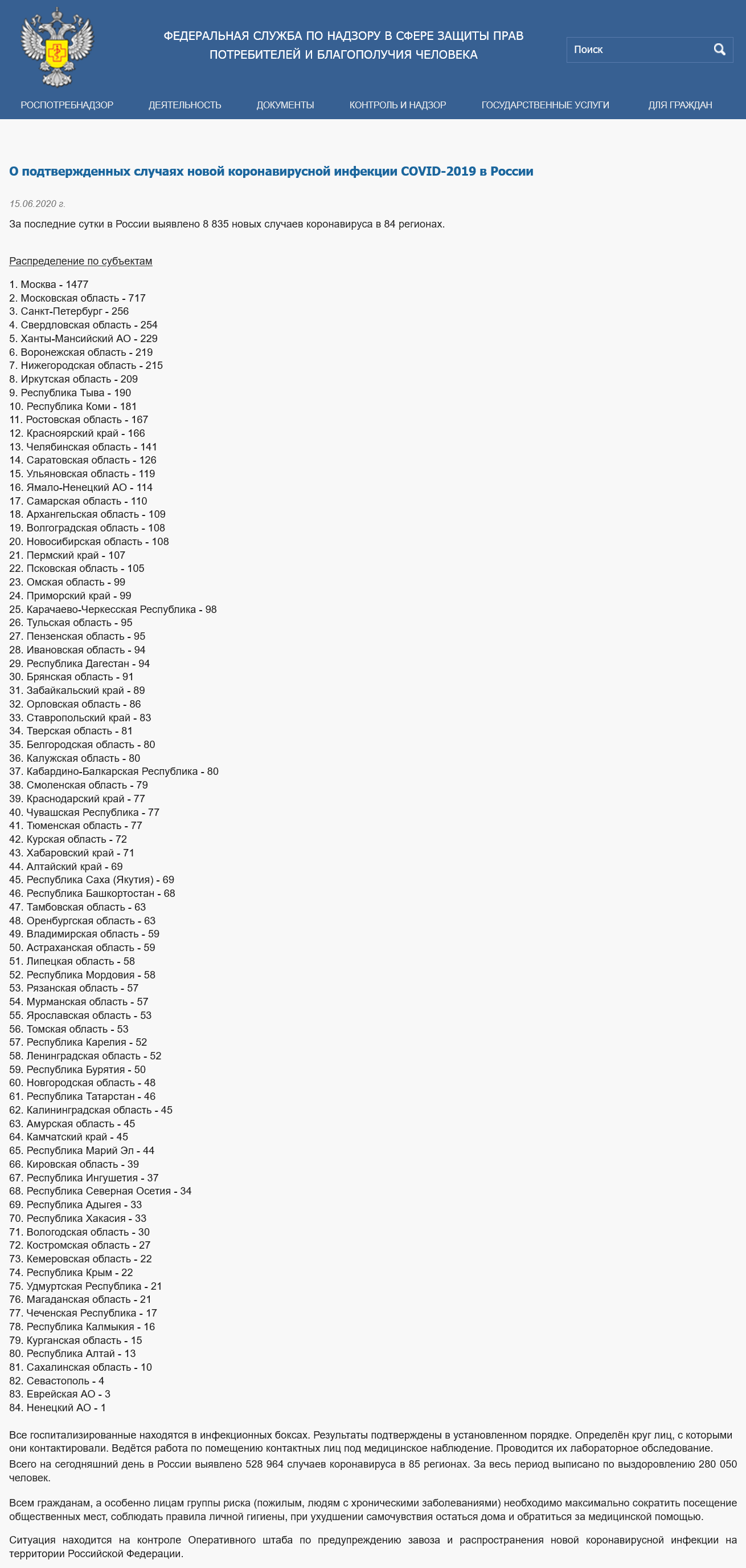 Накануне сообщалось о 8835 новых случаях. С начала эпидемии число заразившихся коронавирусом в 85 российских регионах составило 537 210. Из них более 284 тысяч выздоровели, 7091 человек скончался.