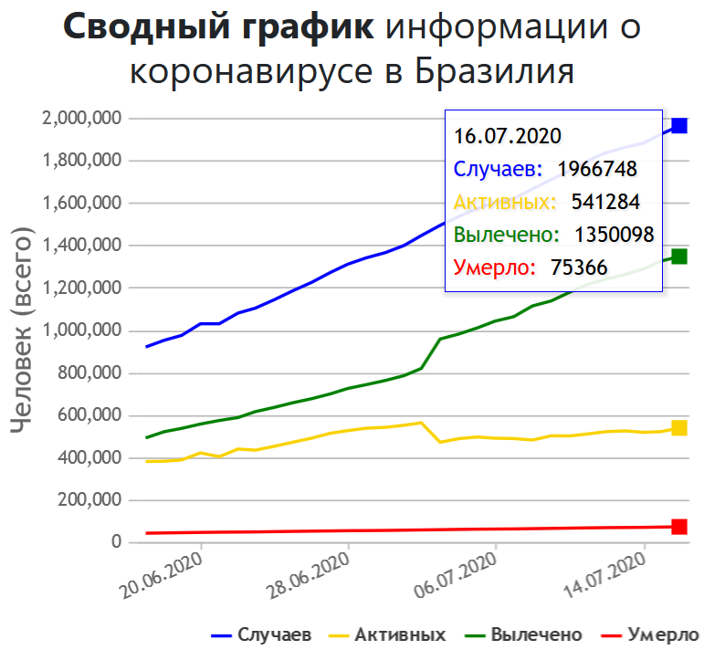 В мире, по данным ВОЗ, насчитывается уже свыше 13,1 миллиона больных COVID-19, как минимум 574 тысяча из них погибли. Среди наиболее подверженных вирусу стран, согласно подсчетам Университета Джонса Хопкинса, — Соединенные Штаты Америки, Бразилия и Индия. Россия находится на четвертой строчке, за ней следуют Перу, Чили, Мексика, ЮАР, Великобритания, Иран, Пакистан, Испания и Италия.