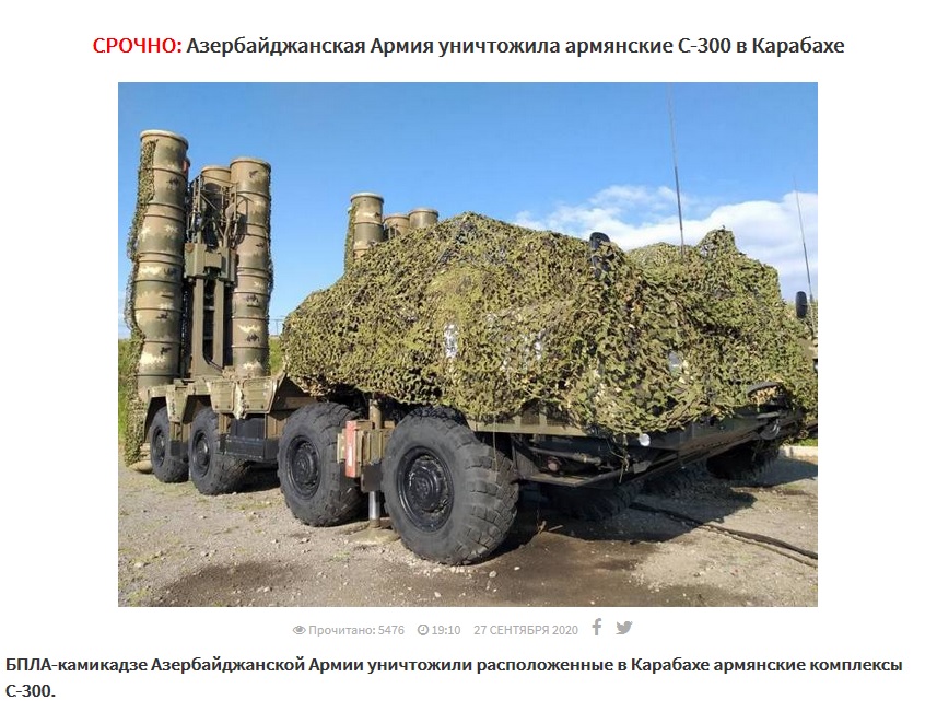Азербайджанские военные беспилотники уничтожили дислоцированные в Карабахе армянские ЗРК С-300. Об этом сообщает сайт ordu.az.