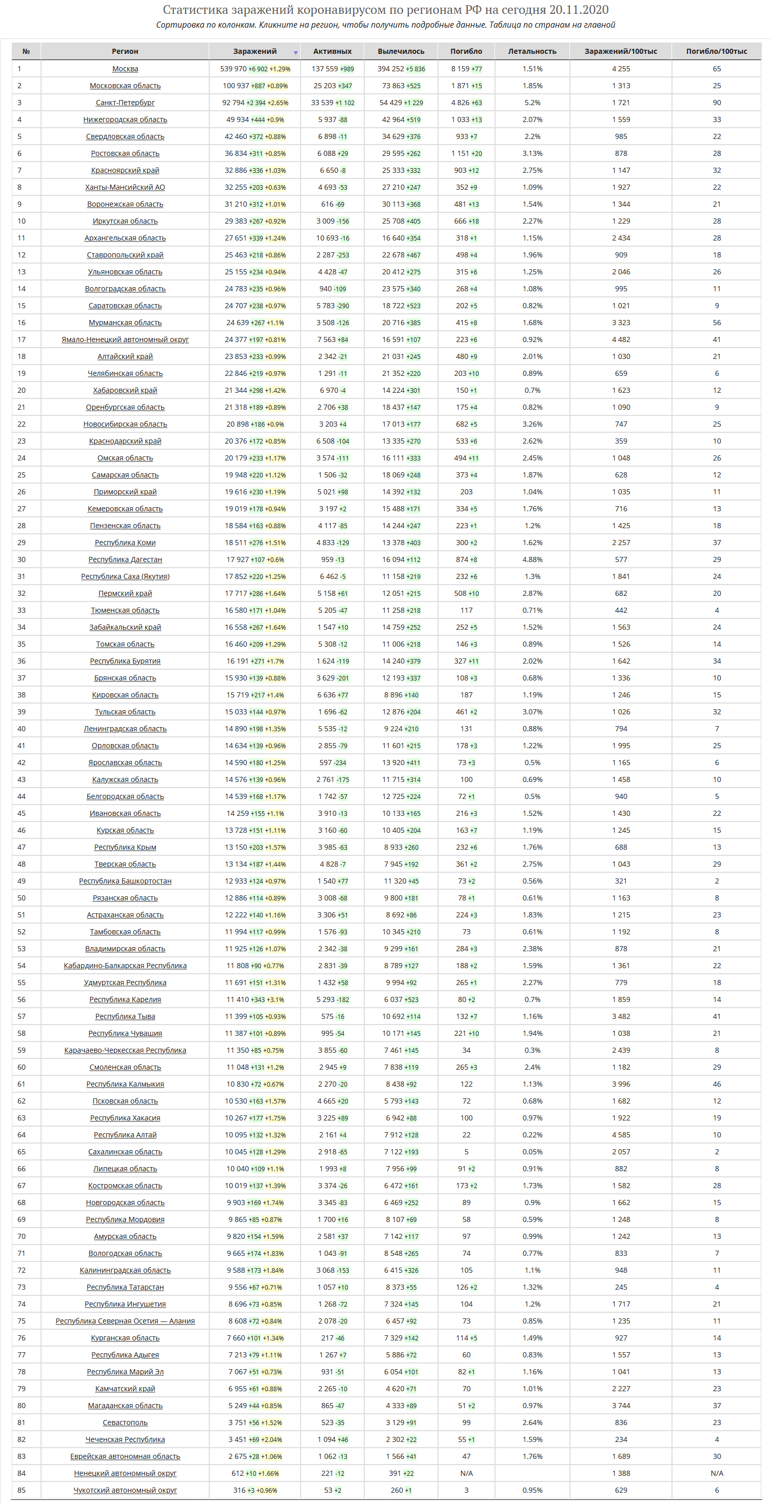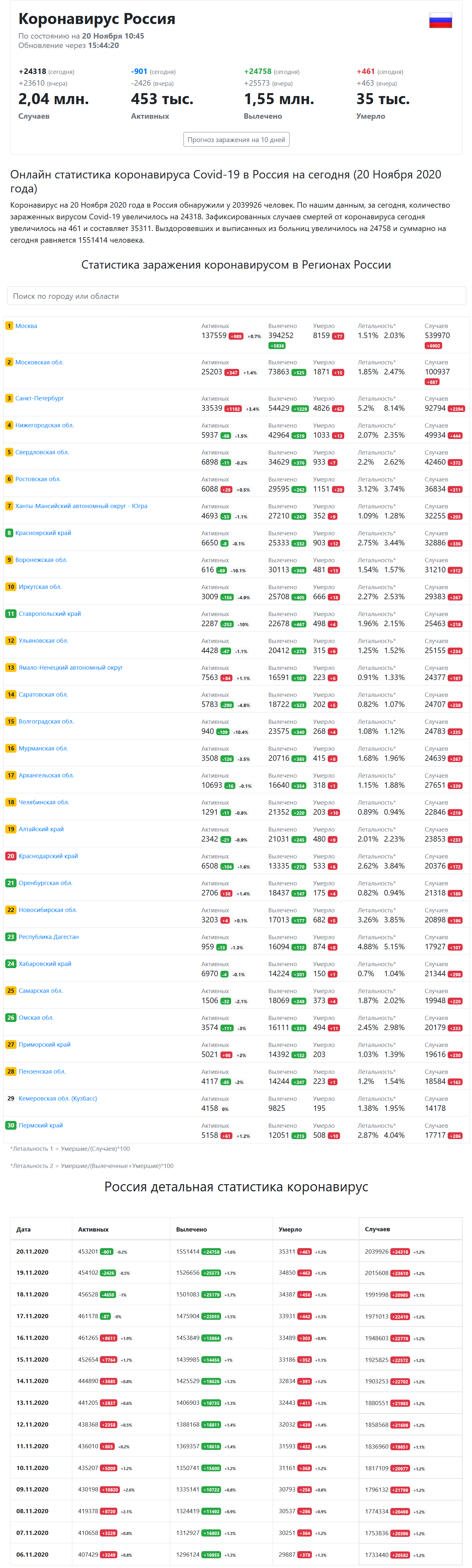 [19.11/COVID-19] В России выявлено 2 039 926 заболевших (+24 318[+1.206%]), выздоровело 1 551 414 (+24 758) человек, 35 311 (+461) скончалось