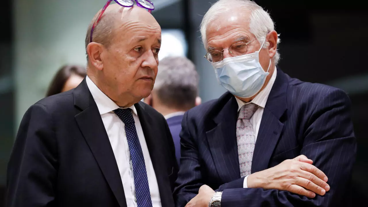 Глава МИД Франции Жан-Ив Ле Дриан (слева) с руководителем дипломатии ЕС Жозепом Боррелем. AP — Olivier Hoslet