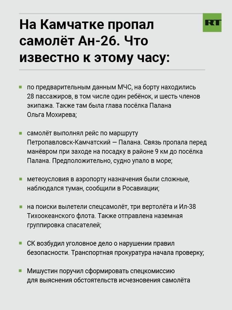 «По предварительным данным, все находившиеся на борту упавшего на Камчатке Ан-26 погибли. Выживших нет», — сказал он.