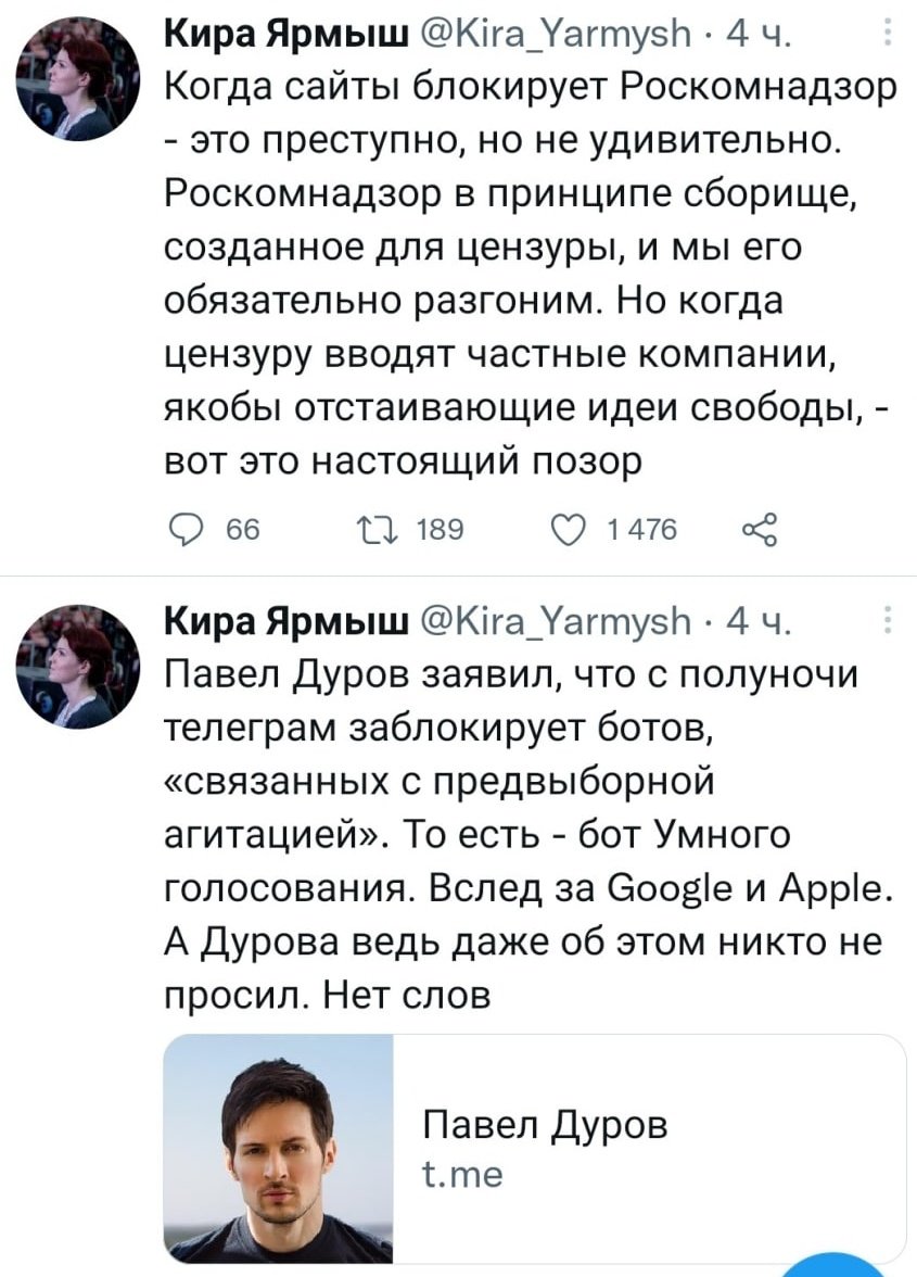 Основатель Telegram Павел Дуров сообщил, что с 18 сентября в этом мессенджере будут блокироваться боты, связанные с предвыборной агитацией в России. Так он прокомментировал решение Apple и Google заблокировать приложение Навального в России.