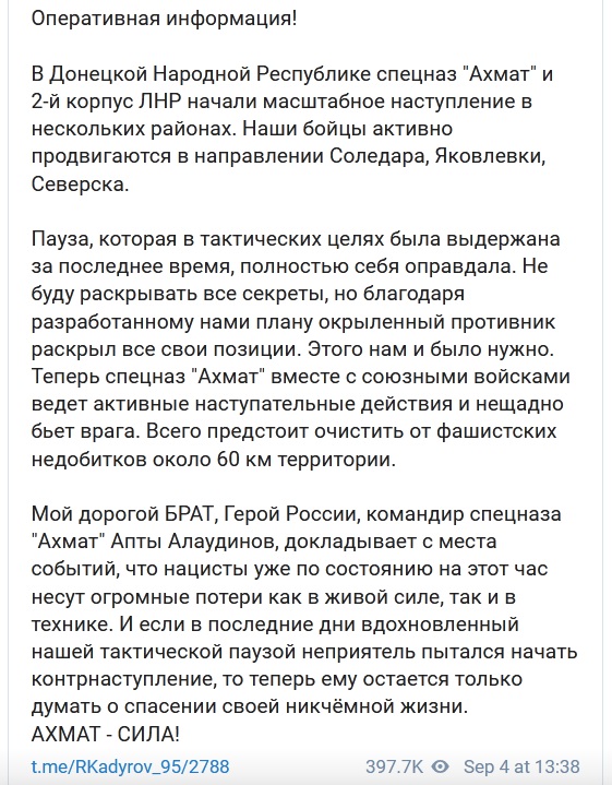 Отряд специального назначения «Ахмат» и второй корпус Луганской Народной Республики начали масштабное наступление в Донецкой Народной Республике, сообщил глава Чечни Рамзан Кадыров в Telegram-канале.