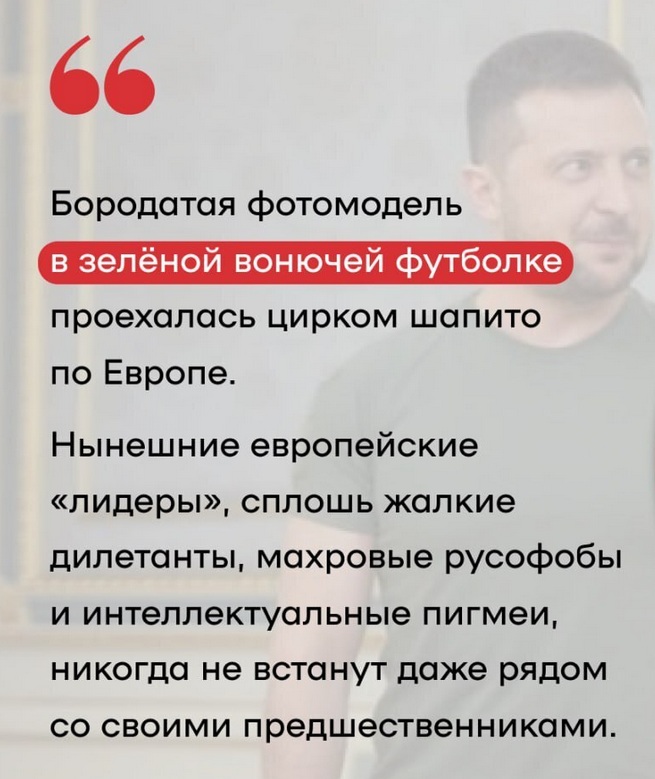 Я уже писал о том, что нынешние европейские «лидеры», сплошь жалкие дилетанты, махровые русофобы и интеллектуальные пигмеи, никогда не встанут даже рядом со своими предшественниками. Теми, кто после самой разрушительной войны в XX веке строил новую, независимую и процветающую Европу. Это было особенно заметно в ходе прошедшего «чёса» украинских вымогателей. Апогеем «цирка уродов» стала аудиенция зелёной засаленной майки у британского монарха.