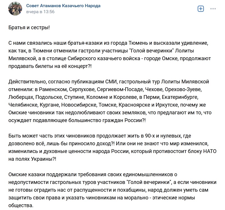 Telegram-канал «Осторожно, новости» сообщил, что омское движение «Совет атаманов казачьего народа» обвинило Лолиту в пропаганде «разного рода сексуальных извращений» и попросило отменить ее выступление «в память о казаках, сложивших голову за святую Русь, защищая Донбасс».