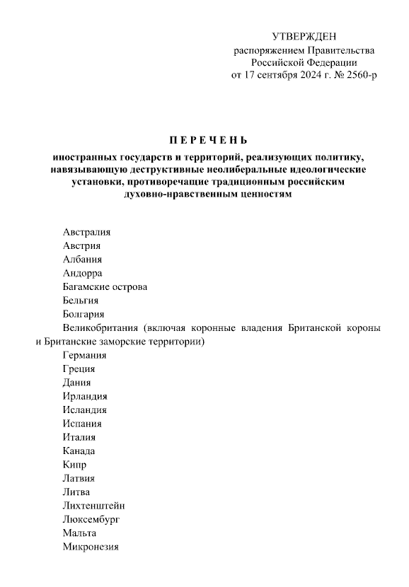 Премьер-министр России Михаил Мишустин утвердил список стран, навязывающих деструктивные установки, противоречащие российским духовно-нравственным ценностям. Соответствующий документ опубликован.