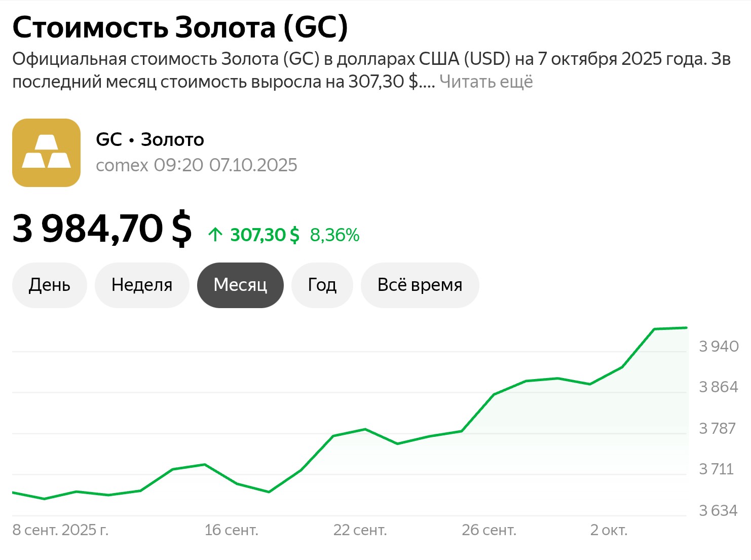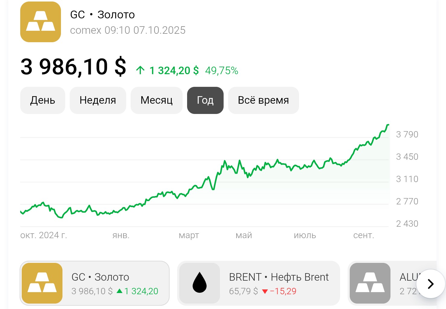 К 7:27 мск декабрьский фьючерс на золото на нью-йоркской бирже Comex дорожал на 19,75 доллара, или на 0,5 процента, — до 3 996,5 доллара за тройскую унцию. При этом ранее в ходе торгов стоимость драгметалла достигала 4000,05 доллара, что стало новым историческим рекордом.