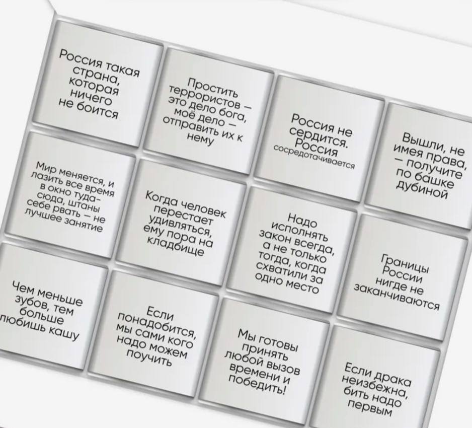 На обертке одной из конфет написано «Своих не бросаем». На коробке конфет с изображением президента РФ написано «Великие слова Великого человека» и одна из цитат Путина: «Вести диалог с Россией с точки зрения силы — бессмысленно».