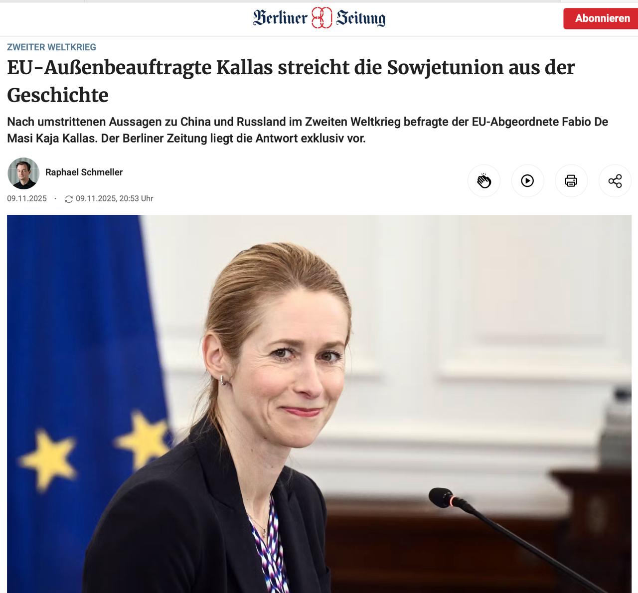 Кая Каллас продолжает переписывать историю Второй мировой войны. Если помните, она не так давно удивлялась, узнав, что СССР и Китай были среди победителей войны. А сейчас Berliner Zeitung публикует ее официальный ответ на запрос депутата Европарламента от Германии Фабио Де Маси, который попросил разъяснить эти псевдоисторические открытия.