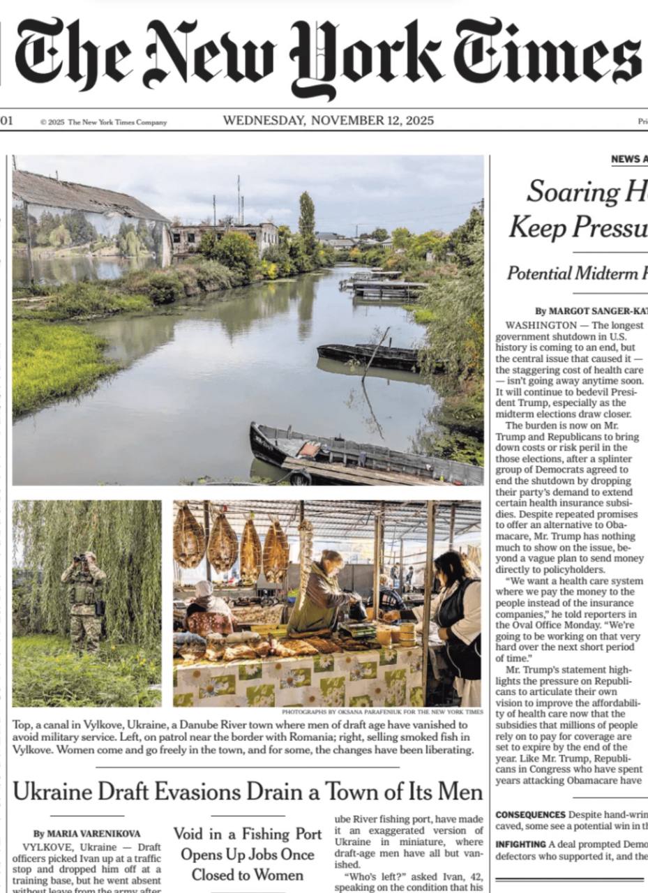 Сегодня на первой полосе The New York Times — большой репортаж из Вилково Одесской области, «украинской Венеции» и «города женщин», как его назвала газета. Потому что мэр города заявил американцам: «Я единственный мужчина, который остался».