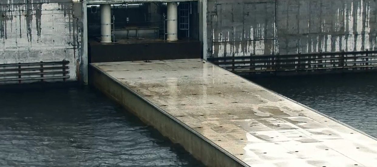 При помощи рельсового механизма затворы из дока выталкивают в судовой проход, где они заполняются водой и опускаются на дно. Для открытия дамбы воду из затворов откачивают, затем задвигают ворота обратно в сухой док.