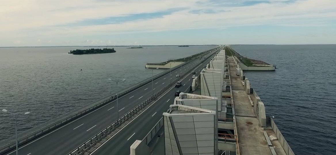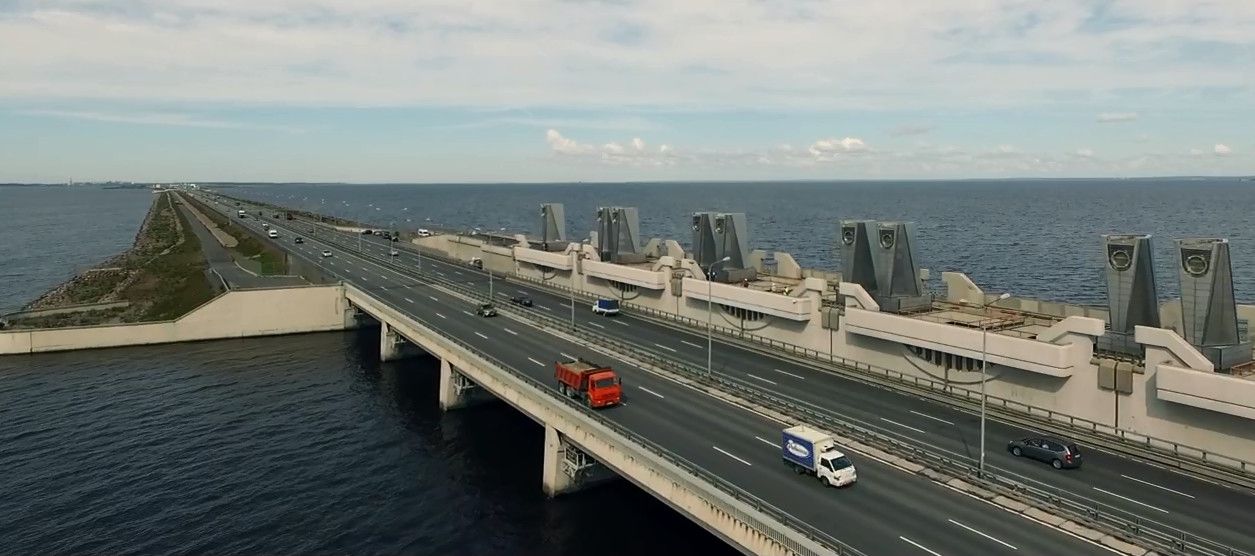 По дамбе проходит Петербургская кольцевая автодорога. Самая необычная ее часть — тоннель. Нижняя точка находится на отметке минус 28 метров. Машины едут два километра под водой.