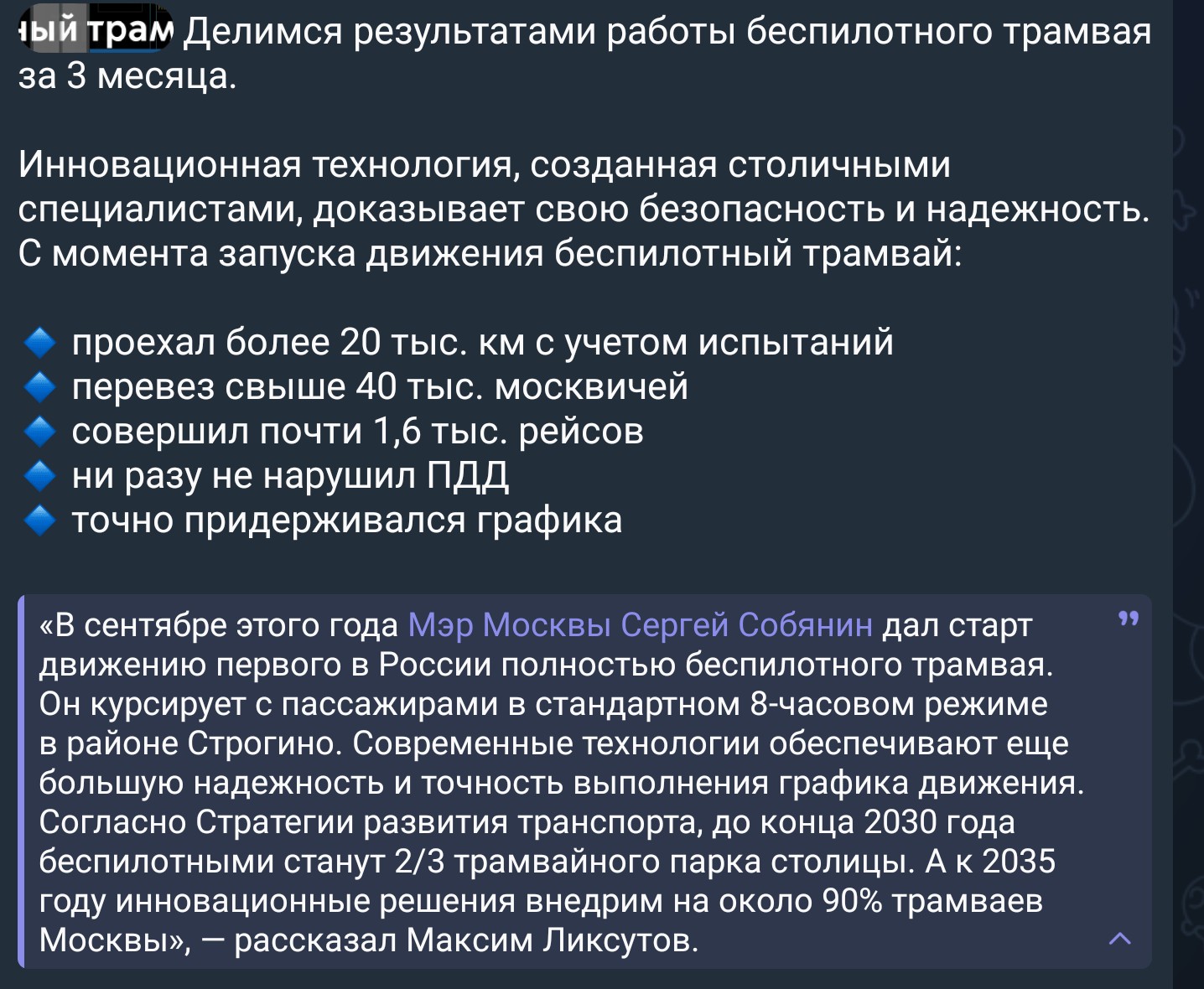«Инновационная технология, созданная столичными специалистами, доказывает свою безопасность и надежность. С момента запуска движения беспилотный трамвай проехал более 20 тыс. км с учетом испытаний, перевез свыше 40 тыс. москвичей, совершил почти 1,6 тыс. рейсов, ни разу не нарушил ПДД, точно придерживался графика», — говорится в сообщении.