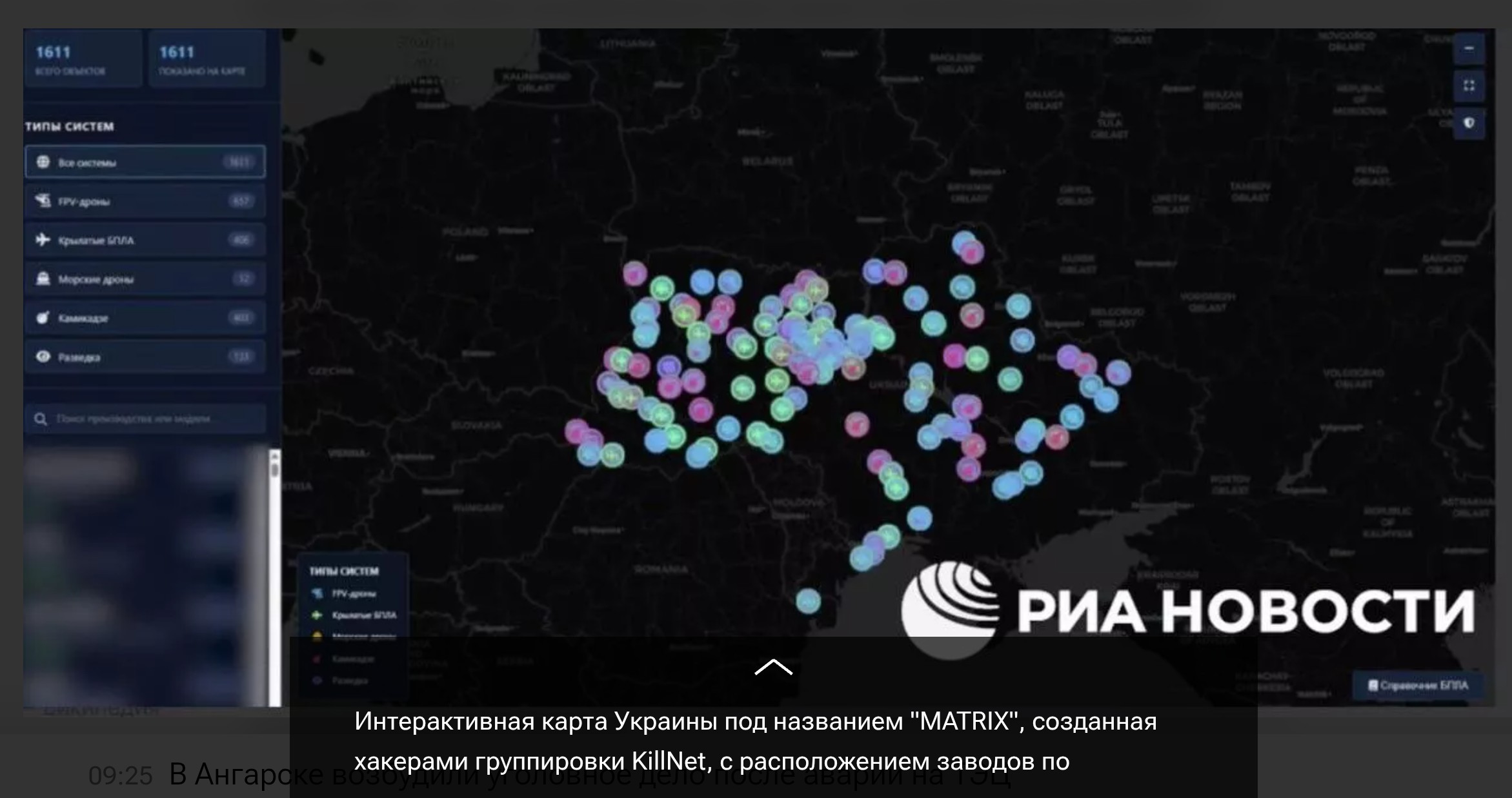 Российские хакеры группировки KillNet создали интерактивную карту Украины под названием MATRIX с расположением заводов по производству беспилотников для ВСУ. Хакеры дали ознакомиться РИА Новости с принципом её работы. Предполагается, что она будет доступна только для российских военных.