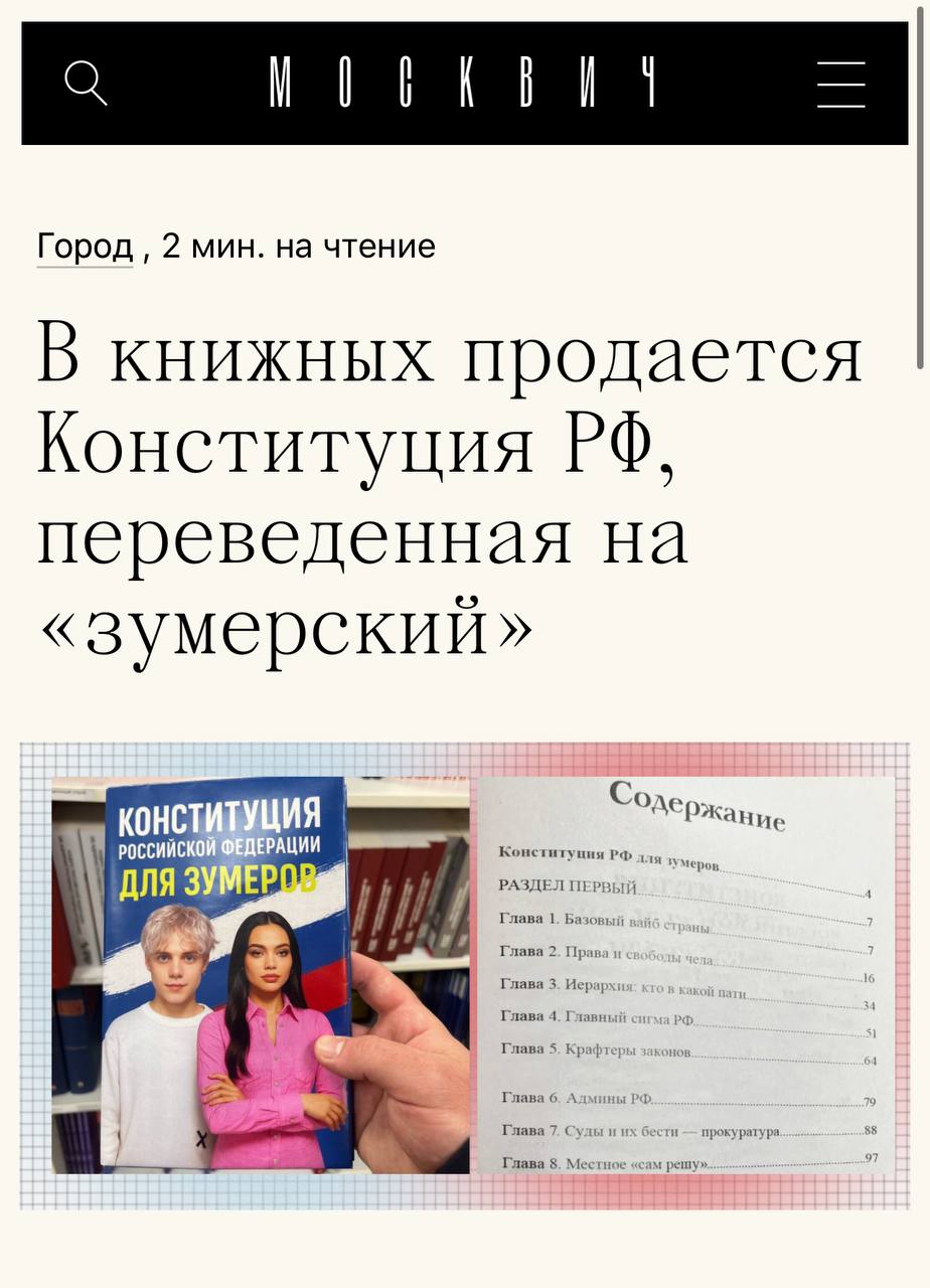 По СМИ расходится новость о том, что в книжном «Читай-город» появилась Конституция для зумеров. В ней говорится, что «Россия — это государство с вайбом «у нас все по серьезке, но без кринжа». И все в таком духе.