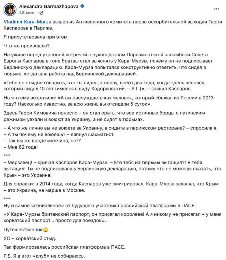 Но вот на этом скрине из соцсетей иноагента Гармажаповой можно разглядеть что-то свежее: Каспаров (тоже иноагента) предъявляет Кара-Мурзе (опять иноагент) за британский паспорт и присягу королеве, одновременно хвастаясь хорватским паспортом.