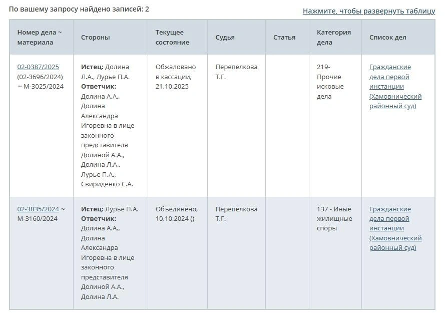 В апреле 2024 года Лариса Долина продала свою квартиру в Хамовниках матери-одиночке Полине Лурье. Из-за срочности продавали элитную недвижимость в два раза ниже рыночной стоимости. За сделку Долина получила 112 миллионов рублей. Когда исполнительница поняла, что столкнулась с мошенниками, то обратилась в суд и потребовала вернуть ей недвижимость. Со встречным иском выступила и Полина Лурье: она просила выселить из квартиры Долину, ее дочь и внучку.