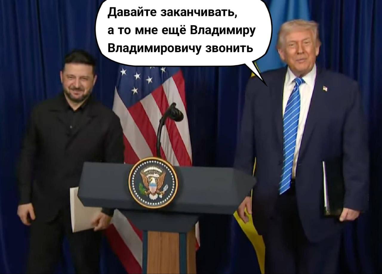 У меня только что состоялся хороший и очень продуктивный телефонный разговор с президентом России Путиным перед моей встречей с президентом Украины Зеленским, которая состоится сегодня в 13:00 в главной столовой Мар-а-Лаго. Пресса приглашается. Спасибо за ваше внимание к этому вопросу!