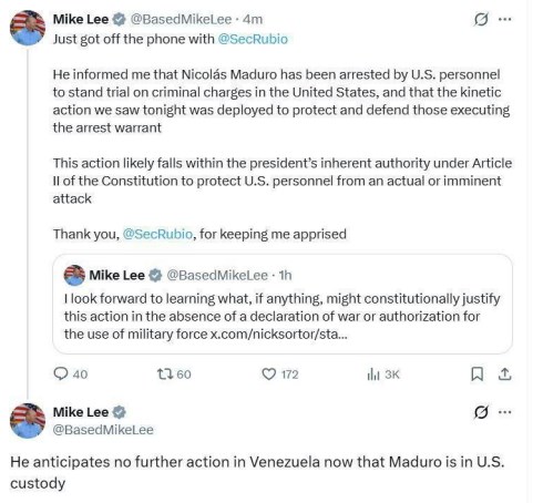 Белый дом начал спешно заверять Конгресс в том, что нынешняя акция в Венесуэле носит разовый характер. Как и с Ираном, была проведена операция “шок и трепет” для оказания психологического давления. Мадуро вывезли по обвинениям в США по договорённости с частью венесуэльской элиты.