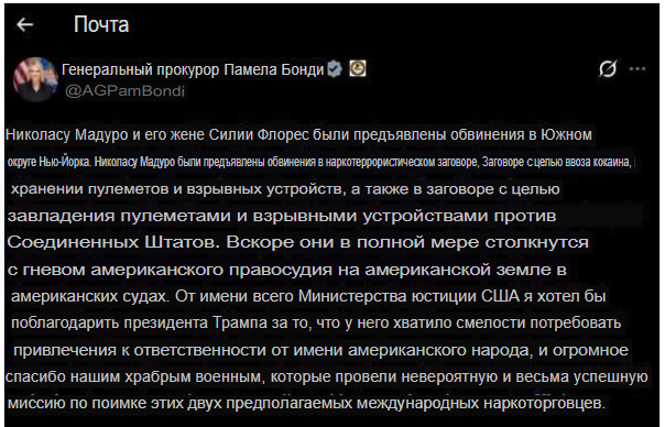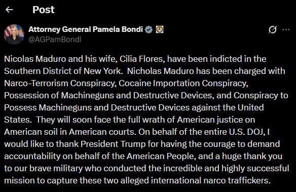 Генеральный прокурор США Пэм Бонди представила обвинительное заключение в отношении президента Венесуэлы Николаса Мадуро и его жены Силии Флорес. Документ был опубликован на странице Бонди в соцсети X*.