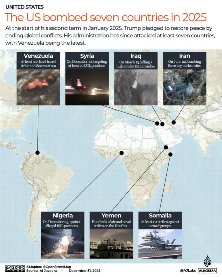 Мониторинговый ресурс за конфликтами ACLED (Armed Conflict Location & Event Data) сообщил Аль-Джазире, что с 20 января 2025 года, когда Трамп вступил в должность, США провели или участвовали в 622 бомбардировках за рубежом с использованием беспилотников или самолётов.