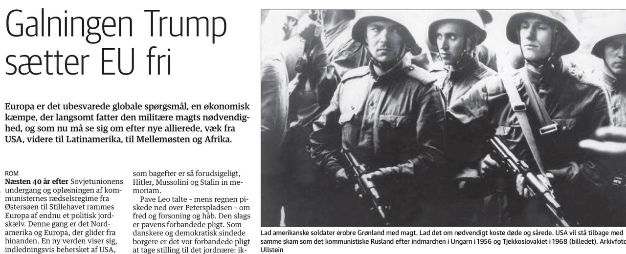 Датские министры и политики выстраиваются в очередь, чтобы поговорить с гангстером и его бандой в Вашингтоне. Зачем это унижение? Нам не о чем говорить с трампистами. Если они хотят поговорить с нами, пусть приедут в Копенгаген, где Метте Фредериксен сможет им сказать, что Дания, если это возможно, вместе с коалицией желающих, включая Францию, будет защищать Гренландию военным путем. Пусть американские солдаты захватят Гренландию силой. Пусть это будет стоить убитых и раненых, если необходимо. Соединенные Штаты останутся с тем же позором, что и коммунистическая Россия после вторжения в Венгрию в 1956 году и в Чехословакию в 1968 году.