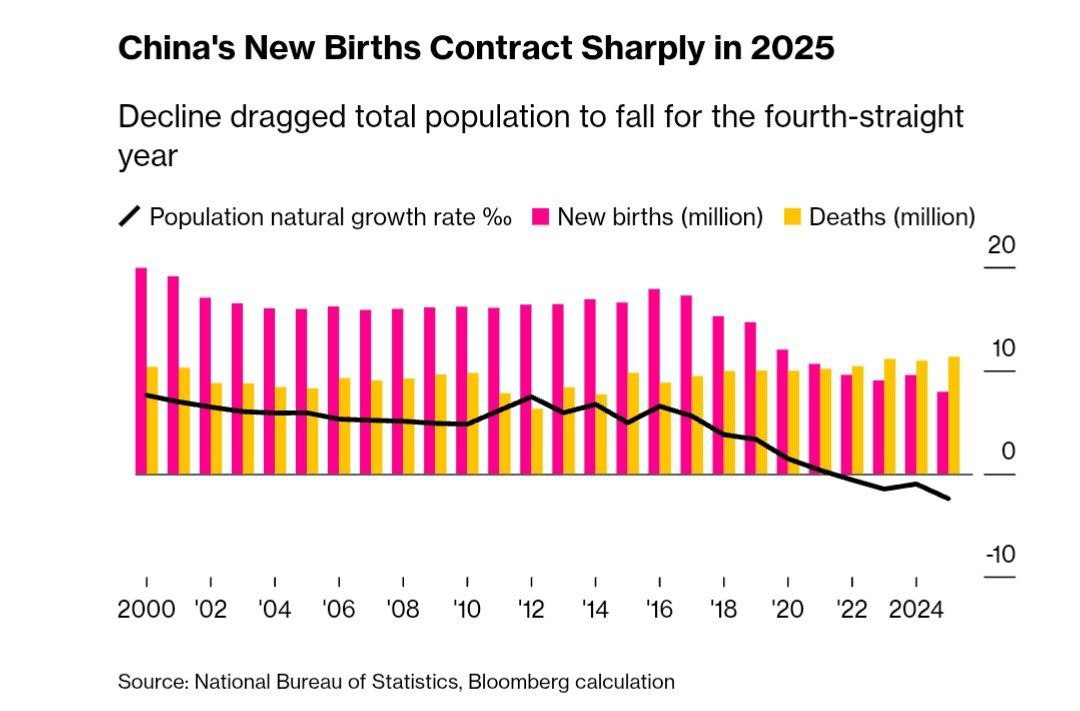 В 2025 году рождаемость в Китае упала до рекордно низкого уровня с 1949 года. Число рождений сократилось до 5,6 на 1000 человек, а общее количество новорождённых составило всего 7,9 млн. Общая численность населения уменьшилась на 3,4 млн человек, что стало самым значительным падением со времён голода начала 1960-х годов.