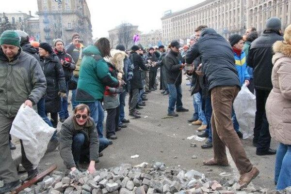Фотофакт — киевские бабушки и дедушки собирают камни, которыми нацисты бьют «Беркут», чтобы через 12 лет остаться без пенсий и срать в пакеты и выгребные ямы во дворах многоэтажек. История успеха, как говорится.