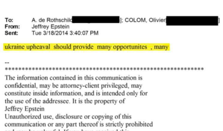 Так, опубликованное письмо датировано мартом 2014 года. В ходе переписки Ротшильд предложила Эпштейну обсудить Украину, на что тот прямо указал на потенциальную выгоду от политических событий в этой стране.