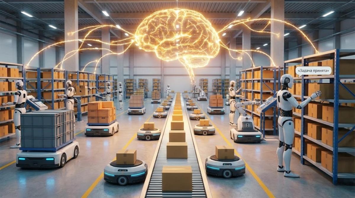 Вместо отдельной настройки каждой машины платформа получает цель, сама раскладывает ее на шаги и контролирует прогресс по всему парку. Если один робот не подходит для конкретной операции или не справляется, задание передается другому.